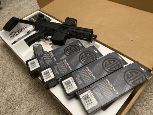 Unconventional design, unmatched performance, and familiar AR handling. The SIG MPX redefines the submachine gun category with a level of operator safety, in-field adaptability, and proven reliability in the harshest environments. Completely ambidextrous, the SIG MPX is great for left- or right-handed shooters with its dual-sided selector switch, magazine release, charging handle, and bolt release. The SIG MPX operates from a fully closed and locked rotating bolt, offering enhanced reliability and safety in use. A short-stroke gas piston allows the SIG MPX to run all weights and brands of 9mm ammunition with no adjustments to the gas valve. A full-length Picatinny rail allows for solid, consistent mounting of optics and targeting lasers. The MPX K PSB features a 4.5″ barrel, telescoping 3-position brace, and a short aluminum KeyMod handguard with a hand stop. mpx-k for sale 2022
